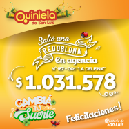 ¡Salió un premio de Quiniela en San Luis! El día Miércoles 30 de Julio, en la Agencia N° 033 "Géminis" de San Luis, salió un premio de Quiniela de $1.000.000 ¡Felicitaciones al afortunado ganador!