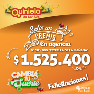 ¡Salió un premio de Quiniela en Villa Mercedes! El día Miércoles 06 de Agosto, en la Agencia N° 537 "Estrella de la Mañana" de Villa Mercedes, salió un premio de Quiniela de $1.525.400 ¡Felicitaciones al afortunado ganador!