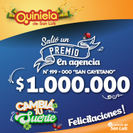 ¡Salió un premio de Quiniela en San Luis! El día Viernes 8 de Agosto, en la Agencia N° 199 "San Cayetano" de San Luis, salió un premio de Quiniela de $1.000.000 ¡Felicitaciones al afortunado ganador!