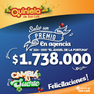 ¡Salió un premio de Quiniela en Villa Mercedes! El día Viernes 01 de Agosto, en la Agencia N° 224 "El Ángel de la Fortuna" de Villa Mercedes, salió un premio de Quiniela de $1.738.000 ¡Felicitaciones al afortunado ganador!