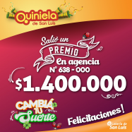 ¡Salió un premio de Quiniela en Buena Esperanza! El día Sábado 2 de Agosto, en la Agencia N° 638 de Buena Esperanza, salió un premio de Quiniela de $1.400.000 ¡Felicitaciones al afortunado ganador!