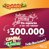 ¡Salió un premio de Quiniela en San Luis! El día Sábado 27 de Mayo en la agencia Nº 033-000 "Geminis" de San Luis salió un premio de Quiniela de $300.000 ¡Felicitaciones al afortunado ganador!