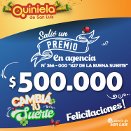 ¡Salió un premio de Quiniela en Villa Mercedes! El día Lunes 24 de Abril en la agencia Nº 366-000 "427 de la Buena Suerte" de Villa Mercedes salió un premio de Quiniela de $500.000 ¡Felicitaciones al afortunado ganador!