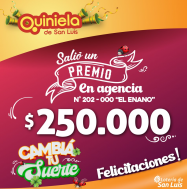 ¡Salió un premio de Quiniela en San Luis! El día  Lunes 19 de Abril en la agencia Nº 202-000 "El Enano" de Quines salió un premio de Quiniela de $250.000 ¡Felicitaciones al afortunado ganador!