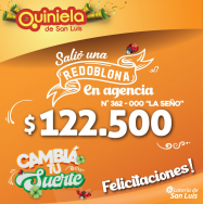 ¡Salió un premio de Redoblona en San Luis ! El día Jueves 20 de Abril en la agencia Nº 362-000  "La Seño" de San Luis salió un premio de Redoblona de $122.500 ¡Felicitaciones al afortunado ganador!