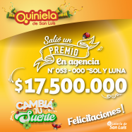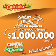 ¡Salió un premio de Quiniela en San Luis! El día Jueves 3 de Julio, en la Agencia N° 033-000 "Géminis" de San Luis, salió un premio de Quiniela de $1.000.000 ¡Felicitaciones al afortunado ganador!