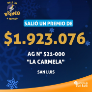 En la modalidad "Brinco Junior"  del sorteo N°1310 del domingo 13 de Julio, un apostador de que jugó en la Ag N°521-000 "La Carmela" de San Luis, se llevó un premio de $1.923.076. ¡Felicitaciones al afortunado ganador!