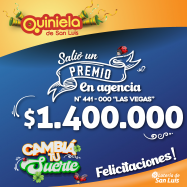 ¡Salió un premio de Quiniela en Villa Mercedes! El día Martes 08 de Julio, en la Agencia N° 441-000 "Las Vegas" de Villa Mercedes, salió un premio de Quiniela de $1.400.000 ¡Felicitaciones al afortunado ganador!