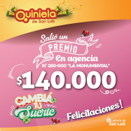 ¡Salió un premio de Quiniela en San Luis! El día Martes 08 de Noviembre en la agencia Nº  250-000 "La Monumental" de San Luis salió un premio de $140.000 ¡Felicitaciones al afortunado ganador!