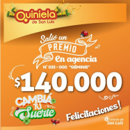 ¡Salió un premio de Quiniela en San Luis! El día Jueves 10 de Noviembre en la agencia Nº 033-000 "Géminis" de San Luis salió un premio de $140.000 ¡Felicitaciones al afortunado ganador!