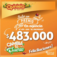 ¡Salió un premio de Quiniela en San Luis! El día Jueves 10 de Noviembre en la agencia Nº 479-000 "El Profesor" de San Luis salió un premio de $483.000 ¡Felicitaciones al afortunado ganador!