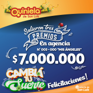 ¡Salieron tres premios de Quiniela en San Luis! El día Sábado 31 de Mayo, en la Agencia N° 003-000 "Mis Ángeles" de San Luis, salieron tres premios de Quiniela de $7.000.000 c/u ¡Felicitaciones a los afortunados ganadores!