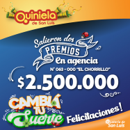 ¡Salieron dos premios de Quiniela en Juana Koslay! El día Jueves 05 de Junio, en la Agencia N° 063-000 "El Chorrillo" de Juana Koslay, salieron dos premios de Quiniela de $2.500.000 c/u ¡Felicitaciones a los afortunados ganadores!
