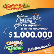 ¡Salió un premio de Quiniela en San Luis! El día Lunes 02 de Junio, en la Agencia N° 326-000 "Zona Virtual" de San Luis, salió un premio de Quiniela de $1.000.000 ¡Felicitaciones al afortunado ganador!