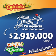 ¡Salió un premio de Quiniela en Villa Mercedes! El día Sábado 31 de Mayo, en la Agencia N° 482-000 de Villa Mercedes, salió un premio de Quiniela de $2.919.000 ¡Felicitaciones al afortunado ganador!