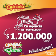¡Salió un premio de Quiniela en Justo Daract! El día Sábado 11 de Octubre, en la Agencia N° 325-000 "El Boci" de Justo Daract, salió un premio de Quiniela de $1.200.000 ¡Felicitaciones al afortunado ganador!