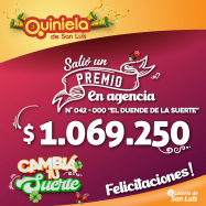 ¡Salió un premio de Quiniela en Buena Esperanza! El día Jueves 16 de Octubre, en la Agencia N° 042-000 "El Duende de la Suerte" de Buena Esperanza, salió un premio de Quiniela de $1.069.250 ¡Felicitaciones al afortunado ganador!