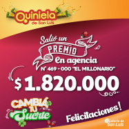 ¡Salió un premio de Quiniela en Villa Mercedes! El día Jueves 16 de Octubre, en la Agencia N° 469-000 "El Millonario" de Villa Mercedes, salió un premio de Quiniela de $1.820.000 ¡Felicitaciones al afortunado ganador!
