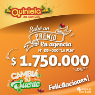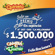 ¡Salió un premio de Quiniela en San Luis! El día Jueves 15 de Mayo, en la Agencia N° 007-000 "La Millonaria" de San Luis, salió un premio de Quiniela de $2.500.000 ¡Felicitaciones al afortunado ganador!