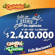¡Salió un premio de Quiniela en Villa Mercedes! El día Sábado 17 de Mayo, en la Agencia N° 431-000 "La Precisa" de Villa Mercedes, salió un premio de Quiniela de $2.420.000 ¡Felicitaciones al afortunado ganador!
