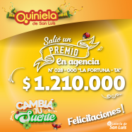 ¡Salió un premio de Quiniela en San Luis! El día Sábado 17 de Mayo, en la Agencia N° 452-000 "El Golpe de Suerte" de San Luis, salió un premio de Quiniela de $2.010.000 ¡Felicitaciones al afortunado ganador!
