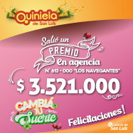 ¡Salió un premio de Quiniela en San Luis! El día Jueves 15 de Mayo, en la Agencia N° 613-000 "Los Navegantes" de San Luis, salió un premio de Quiniela de $3.521.000 ¡Felicitaciones al afortunado ganador!