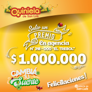 ¡Salió un premio de Quiniela en San Luis! El día Lunes 12 de Mayo, en la Agencia N° 318-000 "El Trébol" de San Luis, salió un premio de Quiniela de $1.000.000 ¡Felicitaciones al afortunado ganador!