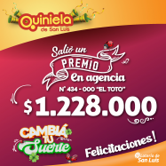 ¡Salió un premio de Quiniela en Quines! El día Martes 06 de Mayo, en la Agencia N° 434-000 "El Toto" de Quines, salió un premio de Quiniela de $1.228.000 ¡Felicitaciones al afortunado ganador!