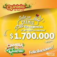 ¡Salió un premio de Quiniela en San Luis! El día Viernes 09 de Mayo, en la Agencia N° 187-000 "Difunta Correa" de San Luis, salió un premio de Quiniela de $2.500.000 ¡Felicitaciones al afortunado ganador!