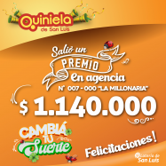 ¡Salió un premio de Quiniela en San Luis! El día Martes 13 de Mayo, en la Agencia N° 007-000 "La Millonaria" de San Luis, salió un premio de Quiniela de $1.140.000 ¡Felicitaciones al afortunado ganador!
