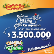 ¡Salió un premio de Quiniela en Merlo! El día Jueves 08 de Mayo, en la Agencia N° 471-000 "El Viejo León" de Merlo, salió un premio de Quiniela de $3.500.000 ¡Felicitaciones al afortunado ganador!