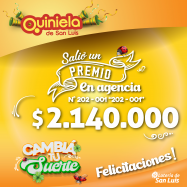 ¡Salió un premio de Quiniela en San Luis! El día Viernes 02 de Mayo, en la Agencia N° 202-001 de San Luis, salió un premio de Quiniela de $2.140.000 ¡Felicitaciones al afortunado ganador!
