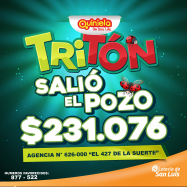 ¡UN GANADOR DEL TRITÓN EN MERLO! En el sorteo "El Primero" del día Sábado 03 de Mayo, hubo un ganador del pozo del Tritón con los números 874 - 587 El afortunado apostador realizó su jugada en la Agencia Nº 048-000 "El Nano" de Merlo y se llevó la suma de $3.406.759  ¡Felicitaciones!