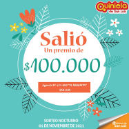 ¡Salió un premio de Quiniela en San Luis! El día vierne 01 de noviembre, en la agencia Nº 421-000 "El Rabanito" de San Luis, salió un premio de Quiniela de $100.000 ¡Felicitaciones al  afortunado ganador!