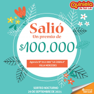 ¡Salió un premio de Quiniela en Villa Mercedes! El día miércoles 29 de septiembre, en la agencia Nº 012-000 "La Cabala" de Villa Mercedes, salió un premio de Quiniela de $100.000 ¡Felicitaciones al  afortunado ganador!