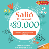 ¡Salió un premio de Quiniela en Tilisarao! El día miércoles 29 de septiembre, en la agencia Nº 170-000 "El Cunina" de Tilisarao, salió un premio de Quiniela de $89.000 ¡Felicitaciones al  afortunado ganador!