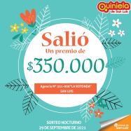 ¡Salió un premio de Quiniela en Villa Mercedes! El día miércoles 29 de septiembre, en la agencia Nº 351-000 "La Rotonda" de San Luis, salió un premio de Quiniela de $350.000 ¡Felicitaciones al  afortunado ganador!