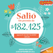 ¡Salió un premio de Quiniela en San Luis! El día miércoles 29 de septiembre, en la agencia Nº 392-000 "El Lucero" de San Luis, salió un premio de Quiniela de $182.125 ¡Felicitaciones al  afortunado ganador!