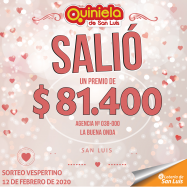 ¡Salio un premio de Quiniela en San Luis! El día miercoles 12 de febrero, en la agencia Nº 038-000 "La Buena Onda"de San Luis, salió un premio de Quiniela de $81.400.   ¡Felicitaciones al afortunado ganador!