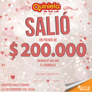 ¡Salio un premio de Quiniela en Juana Koslay! El día miercoles 12 de febrero, en la agencia Nº 063-000 "El Chorrillo"de Juana Koslay, salió un premio de Quiniela de $200.000.   ¡Felicitaciones al afortunado ganador!