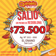 ¡Premio de Redoblona en San Luis!   En el sorteo Vespertino del día sábado 22 de febrero, salió un importante premio de Redoblona. La jugada fue realizada en la agencia Nº 202-000, "El Enano" de San Luis y se llevo $73.500.    ¡Felicitaciones al afortunado ganador!