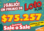 ¡Un premio del Loto Plus en Villa Mercedes!   El ganador acertó a la modalidad Sale o Sale del sorteo N° 3270 del día sábado 08 de febrero. El afortunado jugó su cupón en la Agencia 247-000 "Chayo” de Villa Mercedes   Se llevo un premio de $75.257.   ¡¡FELICITACIONES!!