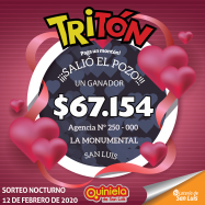 ¡Un ganador del pozo del Tritón en San Luis!   En el sorteo Nocturno Nº 3806 del día miercoles 12 de febrero, hubo un ganador del pozo del Tritón. El afortunado jugo en la Agencia Nº 250-000 "La Monumental" , de San Luis y se llevo el pozo acumulado de $67.154   ¡¡ FELICITACIONES AL GANADOR!