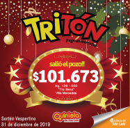 ¡Un ganador del pozo del Tritón en Villa Mercedes!   En el sorteo Vespertino Nº1865 del día martes 31 de diciembre, hubo un ganador del increíble pozo del Tritón. El afortunado jugo en la Agencia Nº 139-000 "Tío Beto" , de Villa Mercedes y se llevo el pozo acumulado de $101.673.   ¡¡ FELICITACIONES AL AFORTUNADO GANADOR!