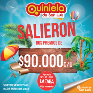 ¡Salieron dos premios de Quiniela en Villa Mercedes! El día sábado 4 de enero, en la agencia Nº 158-000, "LaTaba" de Villa Mercedes, salieron dos premio de Quiniela de $90.000.   ¡Felicitaciones!