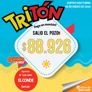 ¡Un ganador del pozo del Tritón en San Luis!   En el sorteo Nocturno Nº 3776 del día miercoles 8 de enero, hubo un ganador del pozo del Tritón. El afortunado jugo en la Agencia Nº 349-000 "El Conde" , de San Luis y se llevo el pozo acumulado de $88.926   ¡¡ FELICITACIONES AL AFORTUNADO GANADOR!