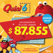 ¡Un ganador del "Siempre Sale" del Quini 6 en Villa del Carmen!   El sorteo Nº 2738 del Quini 6, del día domingo 5 de enero de 2020, dejó un ganador en San Luis. El afortunado jugó su cupón en la Agencia Nº 530-000 "Villa del Carmen" y se llevó el premio de $87.855.   ¡Felicitaciones!