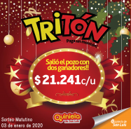 ¡Dos ganadores del pozo del Tritón!   En el sorteo Matutino Nº 3773 del día viernes 3 de enero, hubo dos ganadores del pozo del Tritón.   Hicieron su jugadas en las Agencias: Nº 048-003 "El Nano", de Merlo y se llevo el pozo acumulado de $21.241. Nº 478-000 "La Nene", de Santa Rosa y se llevo el pozo acumulado de $21.241.   ¡FELICITACIONES A LOS ...