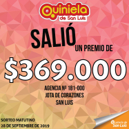 ¡Super premio de Quiniela en San Luis!   El día sabado 28 de septiembre, en la agencia Nº 181-000, "jota de Corazones" de San Luis, salió un premio de Quiniela de $369.000   ¡Felicitaciones al afortunado ganador!