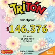 ¡Un ganador del pozo del Tritón en Tilisarao!     En el sorteo El Primero Nº 1838 del día Martes 08 de octubre, la suerte visitó a un afortunado ganador que se llevo el pozo acumulado del Tritón. Jugo en la Agencia Nº 355-000, "Le Gare Nord" de Tilisarao y se llevo $146.376       ¡FELICITACIONES!